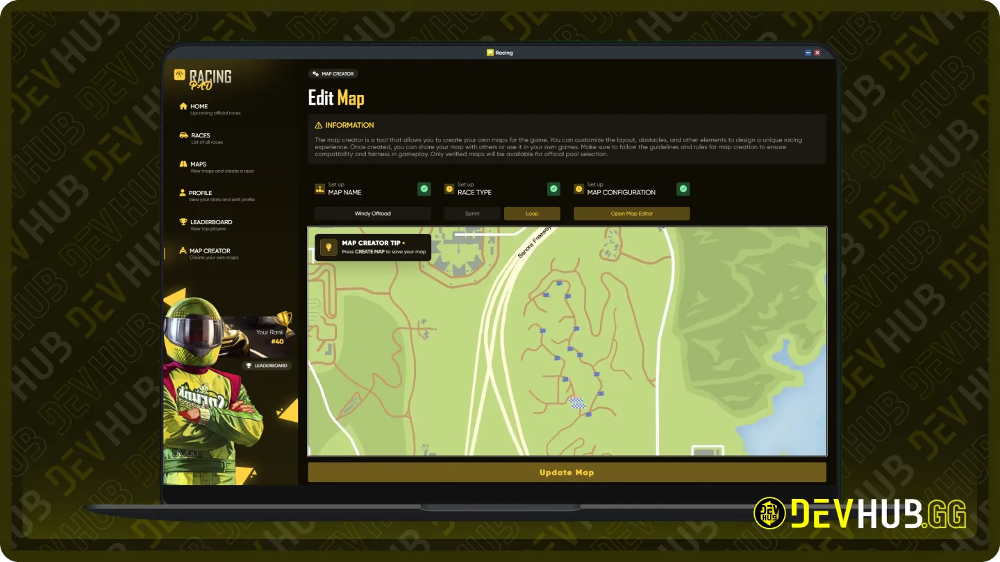 Design competitive and unique race maps from scratch.